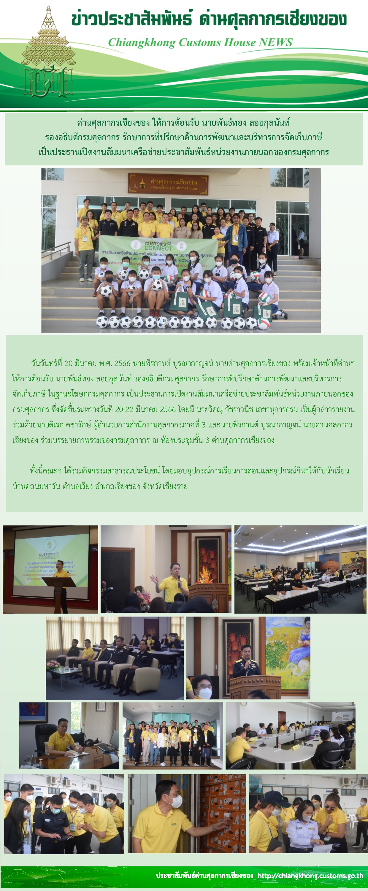 ด่านศุลกากรเชียงของ ให้การต้อนรับ นายพันธ์ทอง ลอยกุลนันท์ รองอธิบดีกรมศุลกากร รักษาการที่ปรึกษาด้านการพัฒนาและบริหารการจัดเก็บภาษี เป็นประธานเปิดงานสัมมนาเครือข่ายประชาสัมพันธ์หน่วยงานภายนอกของกรมศุลกากร
